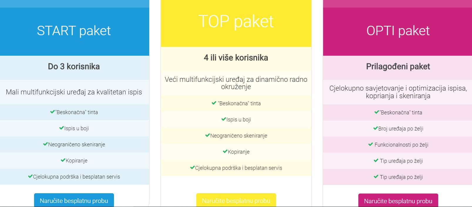 Printanje predstavlja visoki faktor troškova unutar tvrtke. Ono uključuje kupnju novog pisača, stalnu kupnju tonera/tinti, održavanje pisača … U Optiprintu promijenili smo takav pristup razmišljanja. Unutar naše usluge savjetujemo tvrtke o prikladnosti i odabiru pisača ili višenamjenskog uređaja. Također, optimiziramo troškove tiskanja u tvrtki. U većim uredima tvrtke se često odlučuju za iznajmljivanje kombinacije različitih uređaja, poput kopirnih uređaja, multifunkcijskih uređaja i jednostavnih pisača. Međutim, manje tvrtke često nastoje unajmiti učinkovitiji višenamjenski uređaj koji nudi različite funkcije unutar jednog pisača. Sukladno tome, u Optiprintu prilagođavamo našu uslugu i nudimo tri osnovna paketa za najam: START paket, TOP paket i OPTI paket.